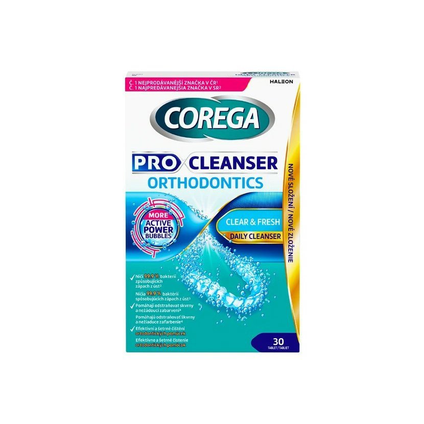 Corega Pro Cleanser Orthodontics tablety jsou neabrazivní a ničí 99,9 % bakterií a pomáhají odstranit skvrny a nežádoucí zabarvení. Pro každodenní hygienickou péči o ortodontické pomůcky a rovnátka.Technologie Crystal Clear pomůže udržet vaši ortodontickou pomůcku (rovnátka atd.) čistou a průhlednou.