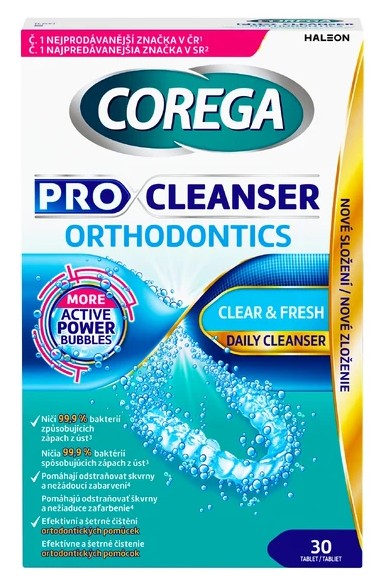 Corega Pro Cleanser Orthodontics tablety jsou neabrazivní a ničí 99,9 % bakterií a pomáhají odstranit skvrny a nežádoucí zabarvení. Pro každodenní hygienickou péči o ortodontické pomůcky a rovnátka.Technologie Crystal Clear pomůže udržet vaši ortodontickou pomůcku (rovnátka atd.) čistou a průhlednou.