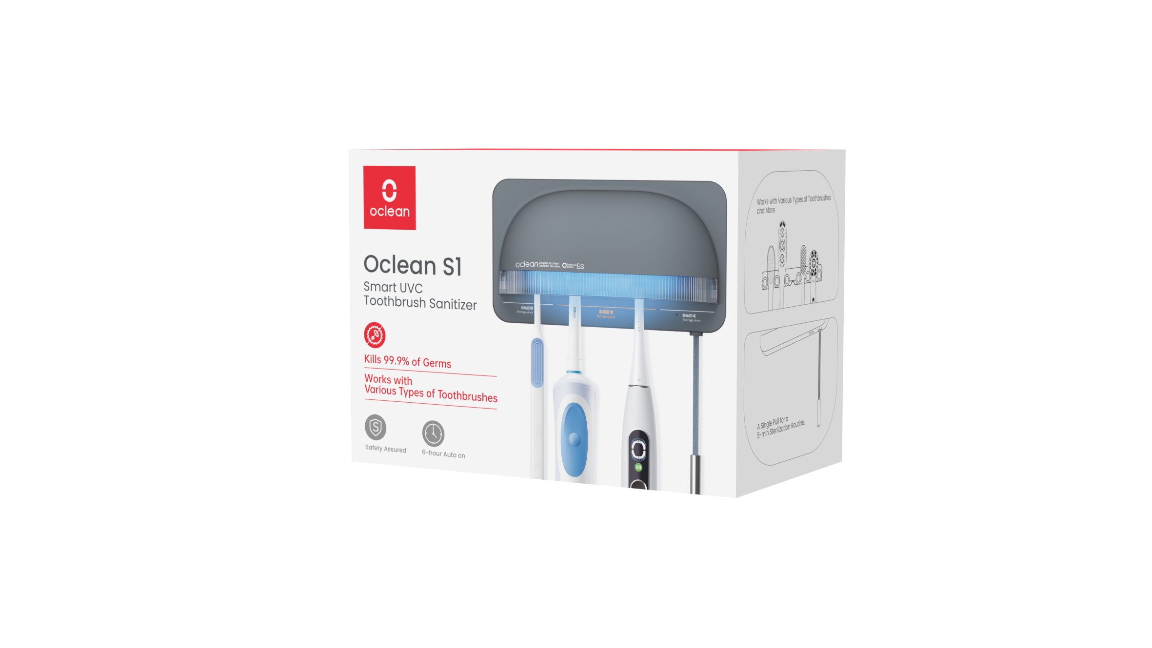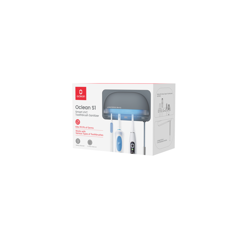 Prostřednictvím UVC-LED záření lze rychle a účinně sterilizovat zubní kartáčky a odstranit tak až 99,9 % bakterií. Oclean sanitizér S1 zajistí, že vaše pomůcky na čištění zubů budou vždy hygienické, čímž můžete účinně předcházet onemocněním dásní, zubnímu kazu a infekčním chorobám.
