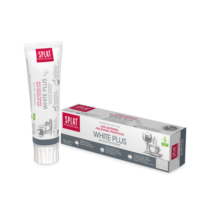 Díky tomu je jejich přirozená bělost zachována po dlouhou dobu. Zubní pastu SPLAT Professional WHITE PLUS ocení také lidé trpící citlivostí zubů díky obsahu draslíku. Vysoce aktivní fosfáty zabraňují tvorbě bakteriálních usazenin a fluoridy chrání zuby před zubním kazem. Klinické studie potvrzují jeho bělicí, čisticí a remineralizační účinky. Výrobek obsahuje fluorid, takže pokud ho užíváte také z jiných zdrojů, poraďte se s lékařem.