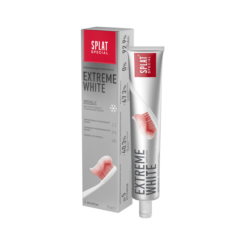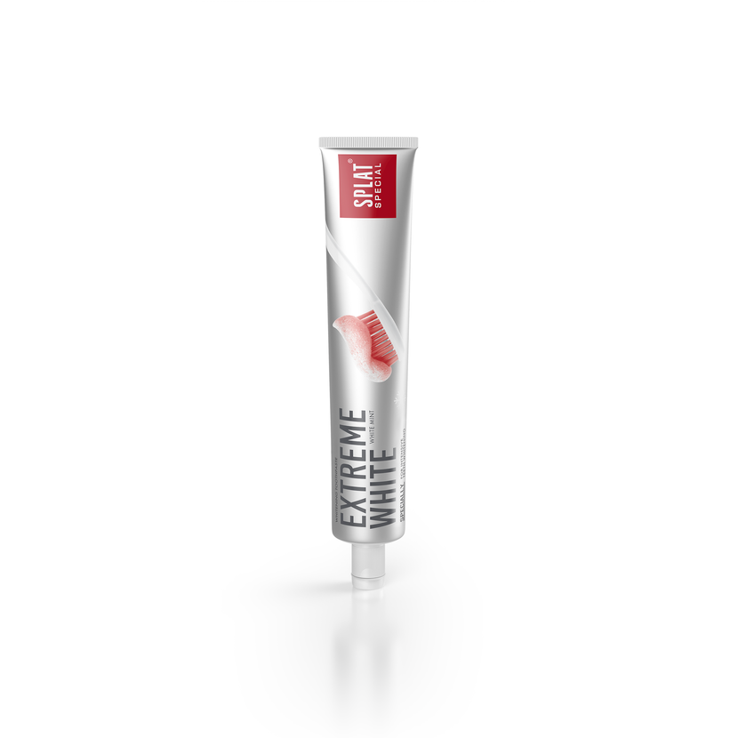 O dva odstíny bělejší zuby za pouhé čtyři týdny? Jistě! Zubní pasta SPLAT Special EXTREME WHITE poskytuje bělicí účinek viditelný pouhým okem díky inovativním mikrogranulím s karbamidperoxidem, kulatými lešticími částicemi a přírodními enzymy.