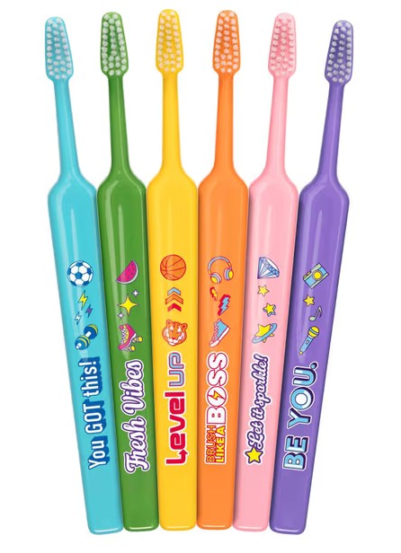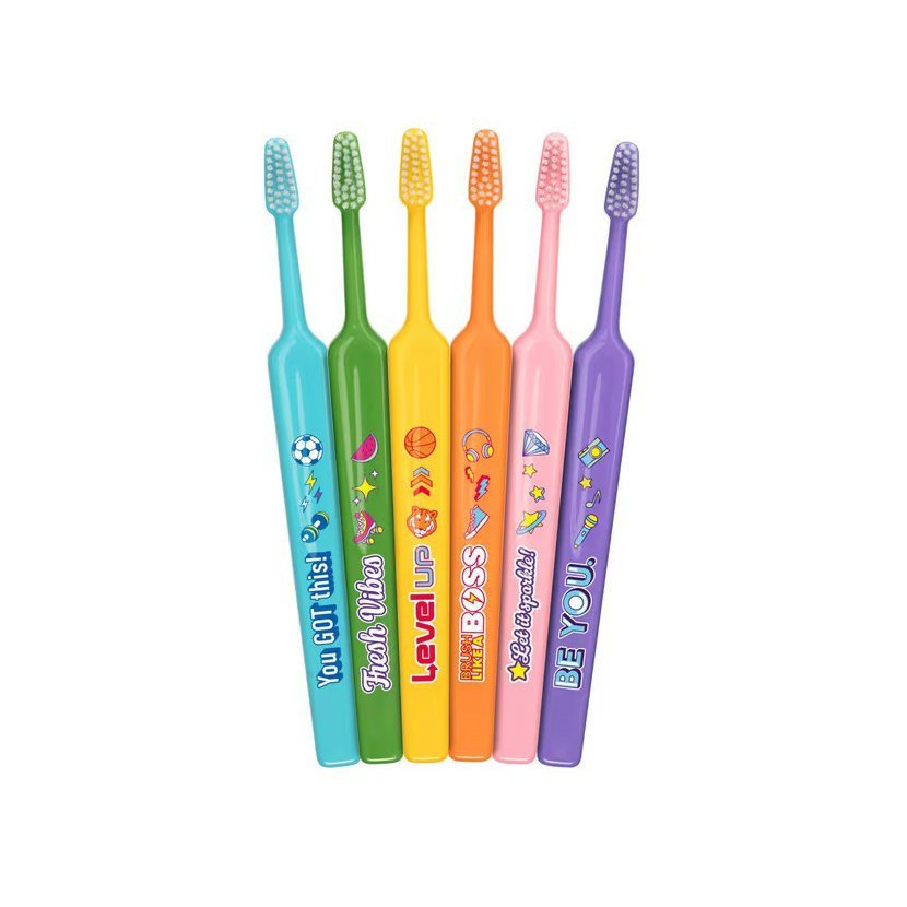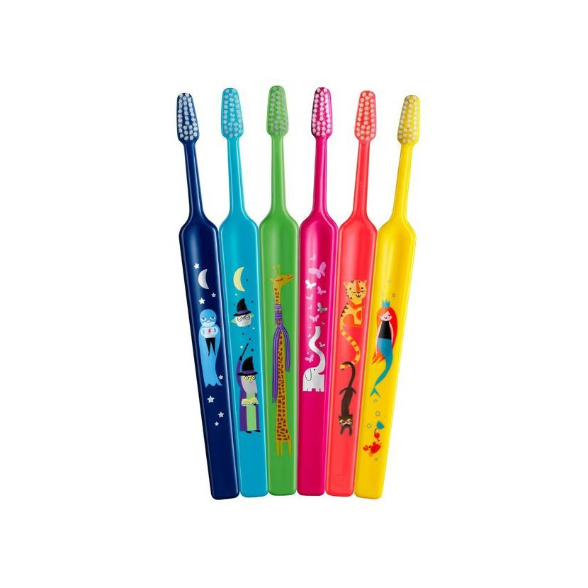 Oblíbený kartáček na zuby s malou trojúhelníkovou hlavicí, plochou rukojetí a měkkými vlákny s rovným zástřihem v decentním jednobarevném provedení s roztomilými obrázky.